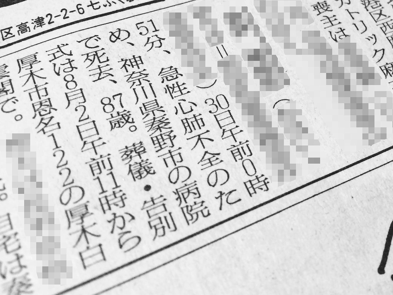 1991年の新聞の訃報欄。葬儀・告別式の告知がなされている。