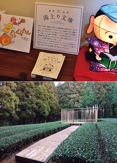 (上)2017年に開設された湯上り文庫。「まちの人」50人が1人3~5冊選んだ小説や漫画、写真集、絵本など多彩な200冊が並ぶ。(下)茶畑の中につくられた能舞台のような「杜の茶室」。