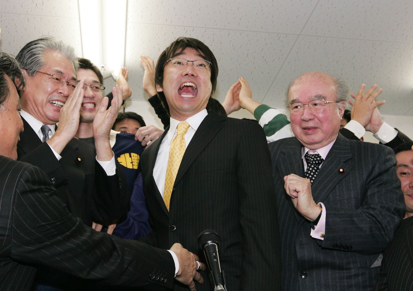 2008年1月27日、大阪府知事選挙で当選を確実とし、中山太郎自民党衆院議員(右)らの待つ祝勝会場に到着した橋下徹氏(中央)。大阪市北区の選挙事務所にて(写真=時事通信フォト)