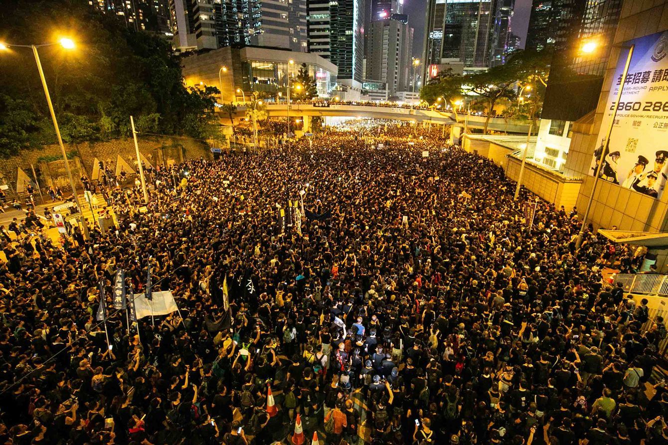 6月16日、香港の金鐘(アドミラルティ)で行われた大規模デモの様子。デモ隊は「加油(ガーヨウ=がんばれ)」「不撤不散 (バッチーバサーン=撤回するまで解散しない)」と声をあげながらあたり一面を覆い尽くした(撮影=的野弘路)