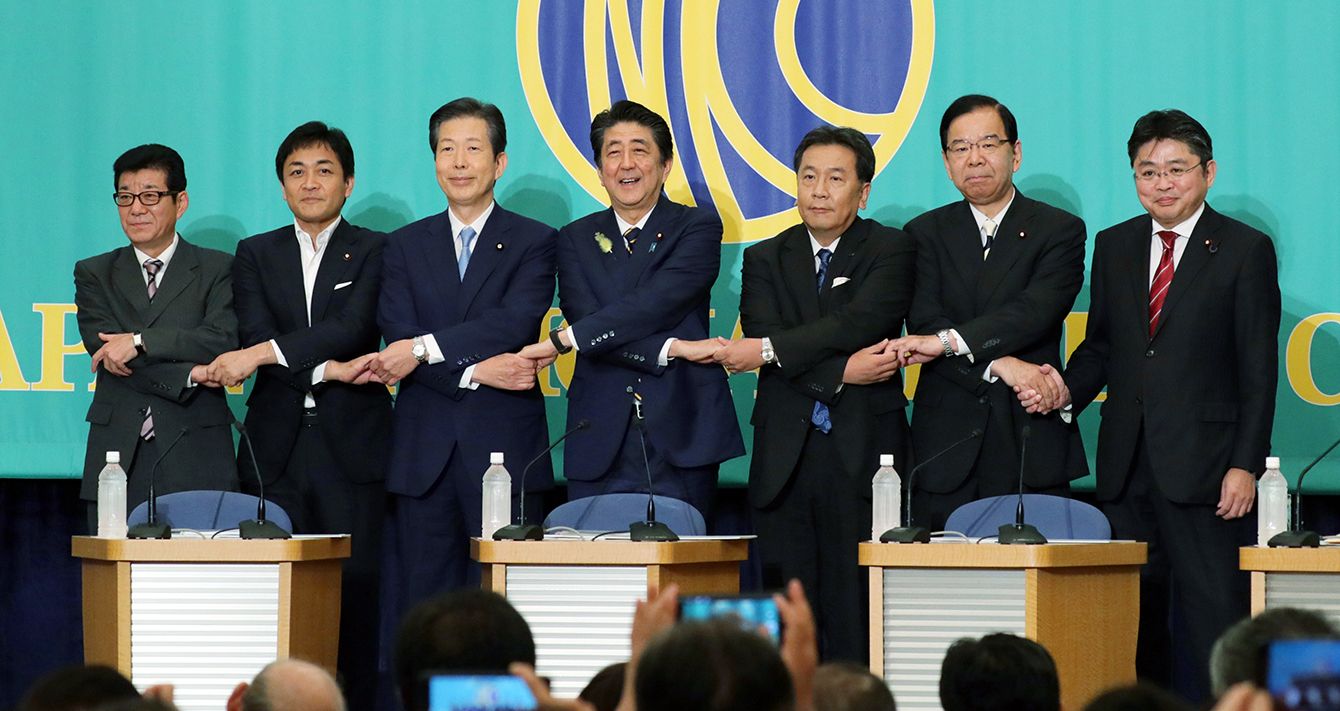 日本記者クラブ主催の党首討論会で、握手する与野党7党の党首ら=2019年7月3日、東京都千代田区の日本プレスセンター(写真=時事通信フォト)