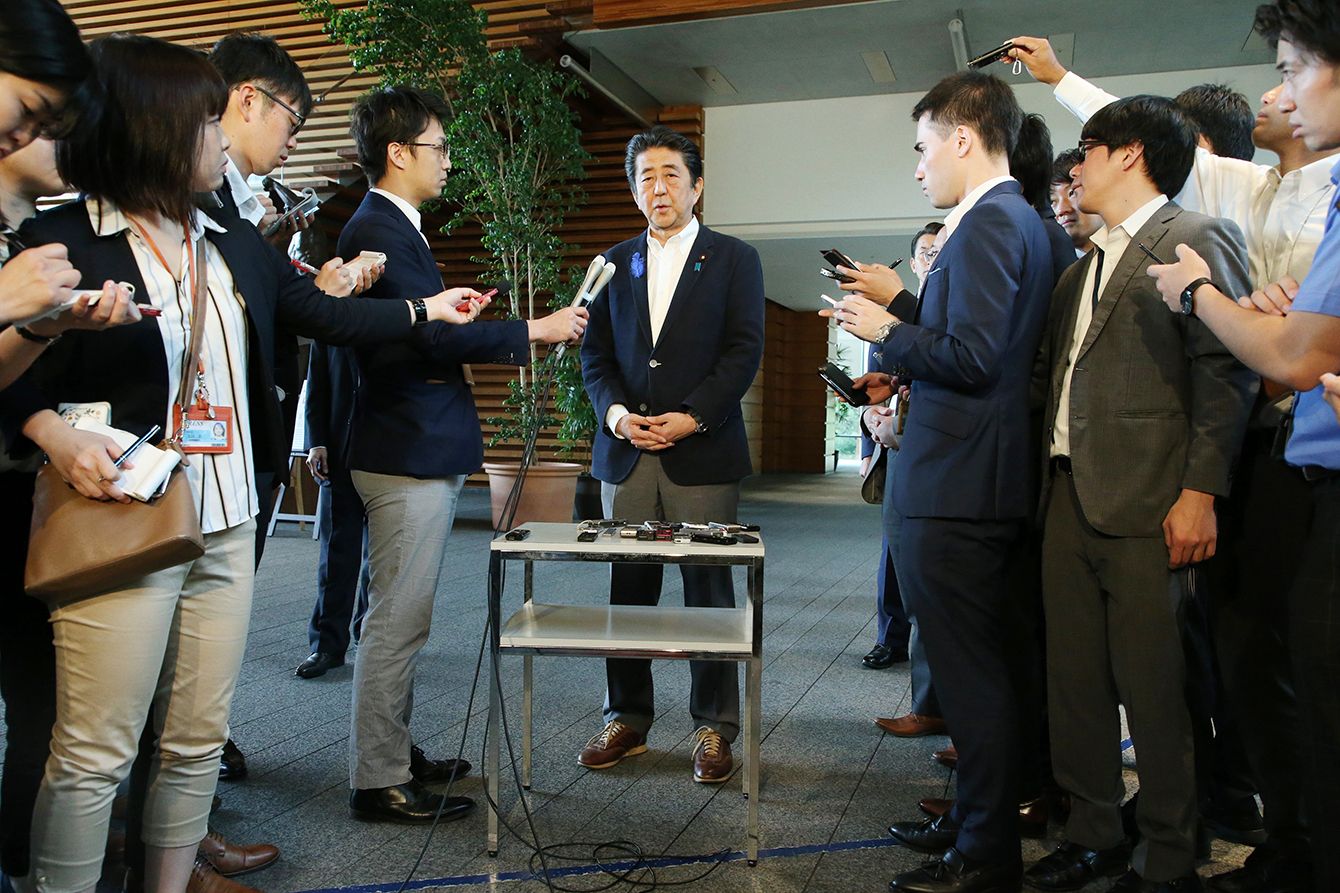 ハンセン病元患者家族の訴えを認めて国に賠償を命じた熊本地裁判決について、控訴断念を表明する安倍晋三首相=7月9日、首相官邸(写真=時事通信フォト)
