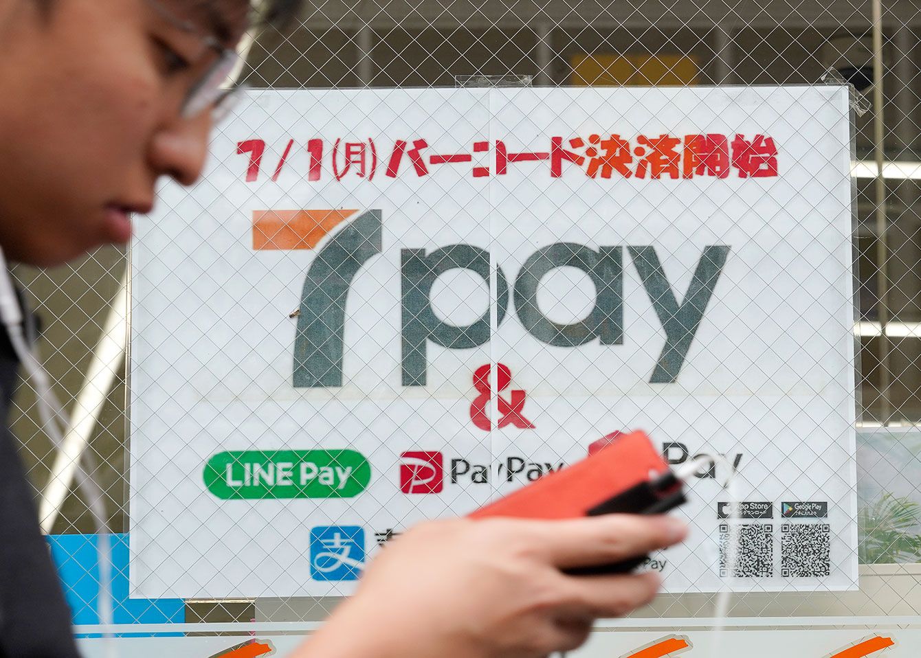 セブンイレブンの「7Pay」の案内(東京都新宿区)。セブン&アイHDは、全国のセブンで7月1日に始まったバーコード決済サービス「7Pay」で、第三者による不正利用が発生し、約900人が計約5500万円の被害に遭った恐れがあると発表した。(写真=時事通信フォト)