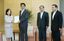 2018年08月10日、人事院の一宮なほみ総裁(左端)から勧告を受け取る安倍晋三首相(左から2人目)。(写真=時事通信フォト)