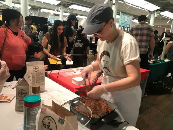 ヴィーガンミートを客に振る舞う食品企業(筆者撮影)