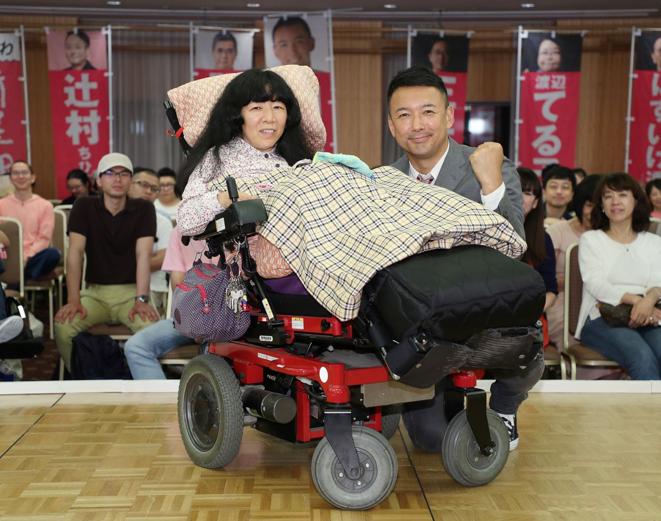 第25回参議院選挙で当選確実となり、撮影に応じるれいわ新選組の木村英子氏(左)と山本太郎代表=22日未明、東京都千代田区(写真=時事通信フォト)