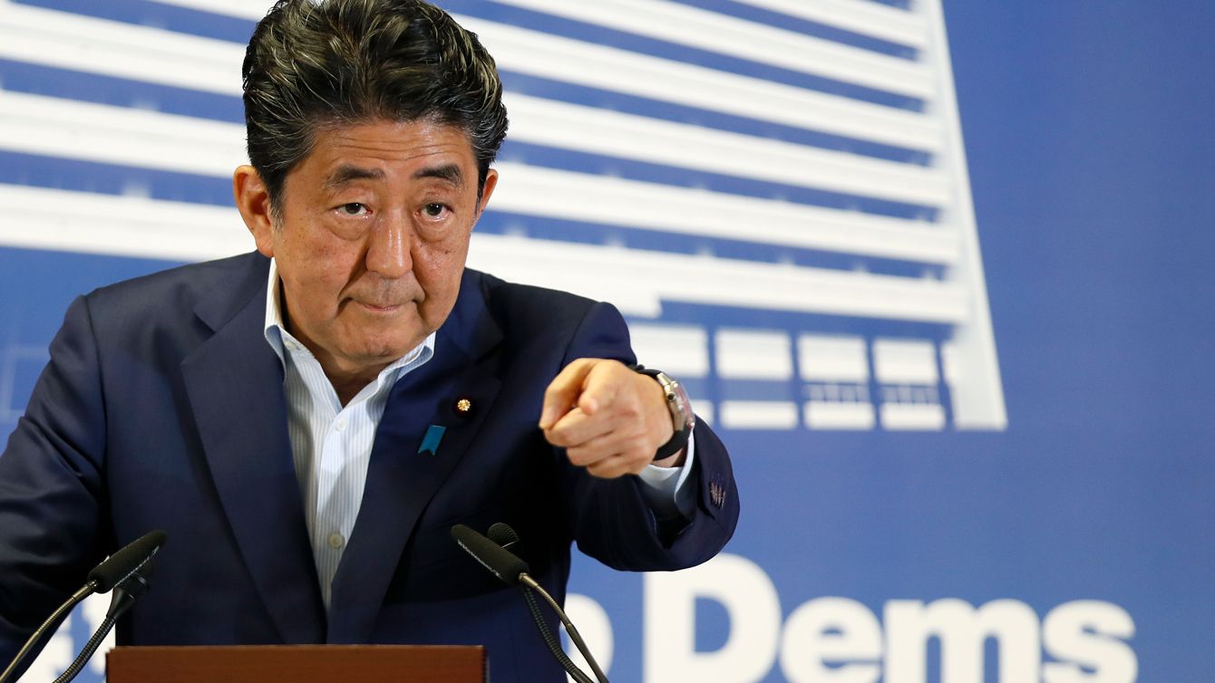 参議院選挙から一夜明け、記者会見で質問者を指名する自民党総裁の安倍晋三首相=7月22日、東京・永田町の同党本部(写真=EPA/時事通信フォト)