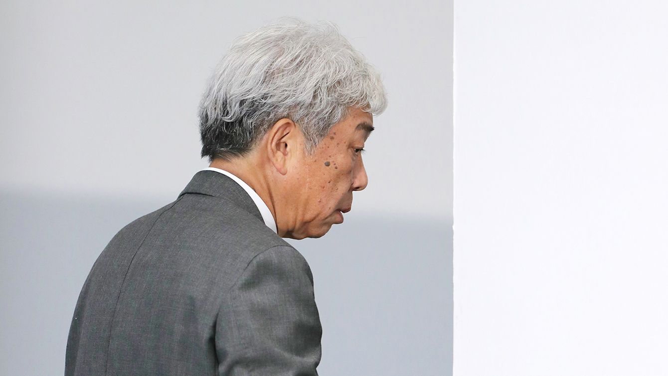 岡本昭彦社長の記者会見場に姿を現した吉本興業の大崎洋会長。だが会見で発言することはなかった。=7月22日、東京都新宿区(写真=時事通信フォト)