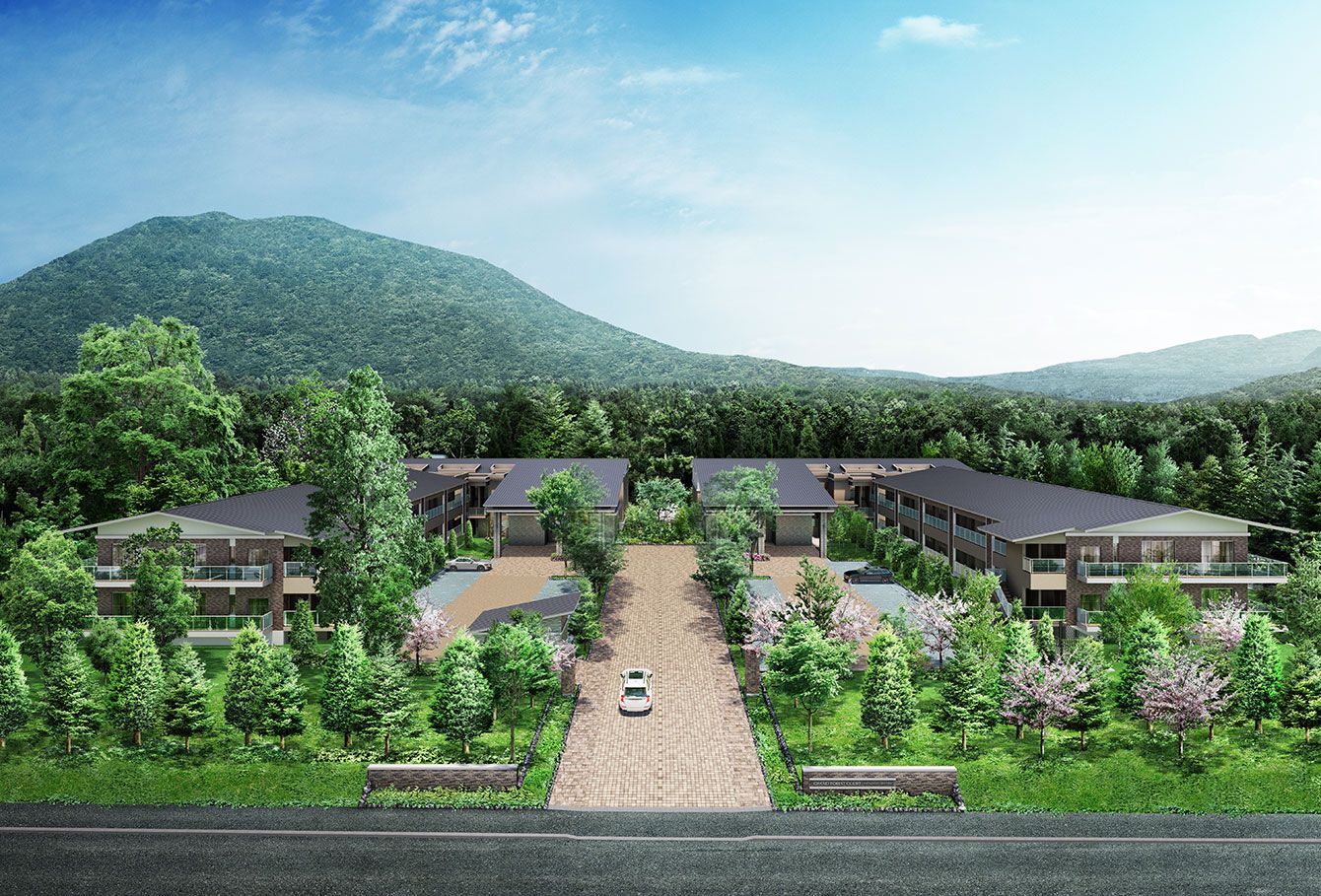 全体外観CG。ゲートからエントランスへのアプローチは幅10m・全長55mもあり、紅葉やモミを配したシンボリックな並木道となる。
