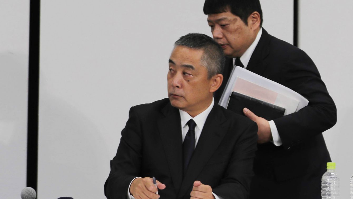 所属タレントが反社会的勢力の会合に出席して金銭を受け取っていた問題で記者会見し、会見中断を受け、控え室に引き揚げる吉本興業の岡本昭彦社長(手前)と藤原寛副社長=2019年7月22日、東京都新宿区。(写真=時事通信フォト)