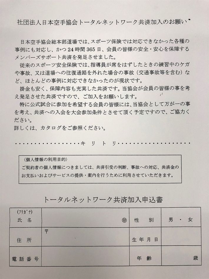 空手協会から届いた共済会への加入を促す会員あての通知文。パンフレットと共に全国の支部に配布された
