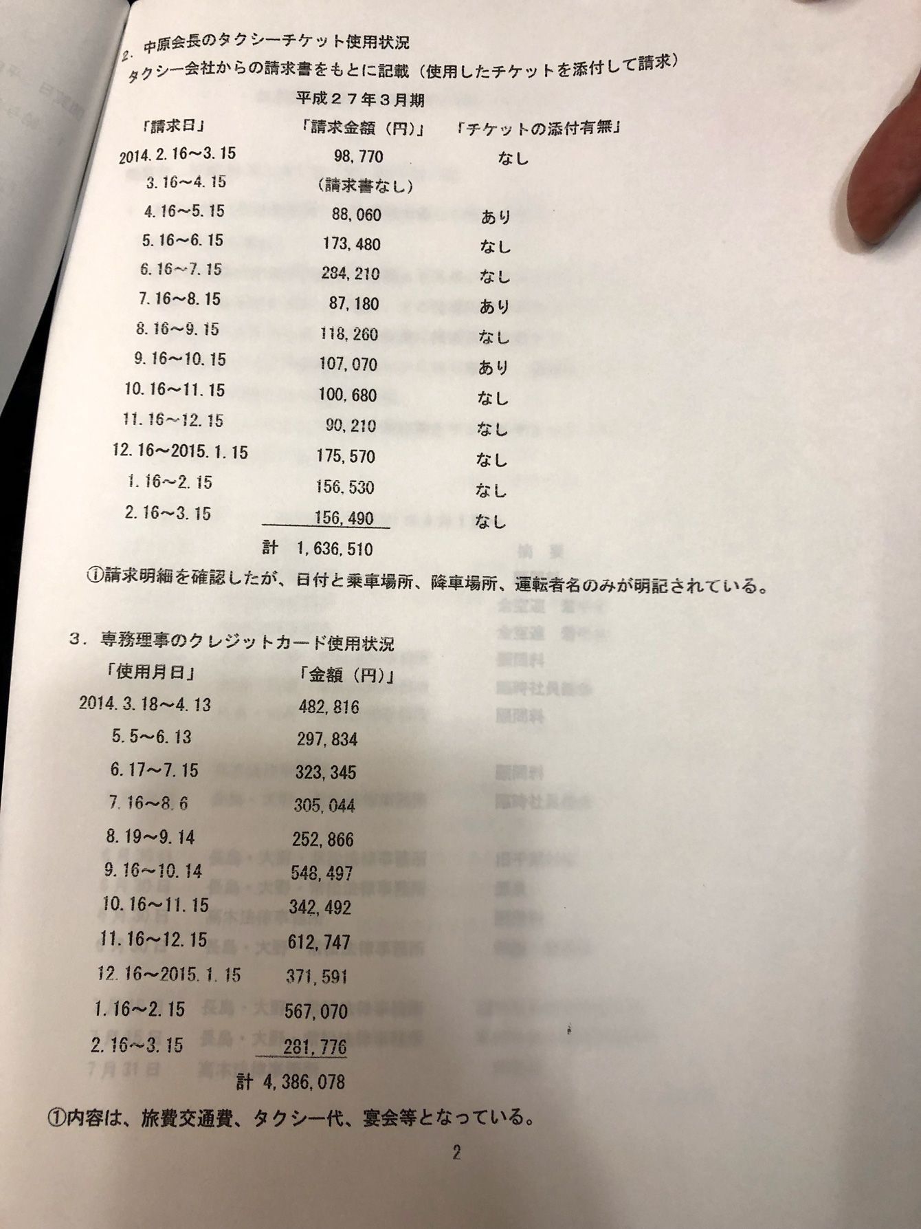 清水税理士がまとめた空手協会の帳簿閲覧結果の一部。中原氏のタクシーチケット代は約164万円、森氏のクレジットカード使用額は約439万円となっている