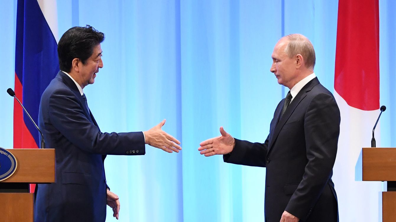 首脳共同記者発表にて握手する安倍晋三(左)と、ウラジーミル・プーチン大統領(右)(写真=SPUTNIK/時事通信フォト)