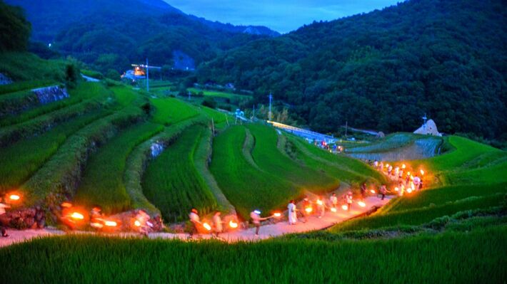 「とーもせ、ともせ」という掛け声とともに千枚田を降りていく