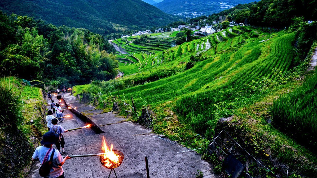 「とーもせ、ともせ」という掛け声とともに千枚田を降りていく