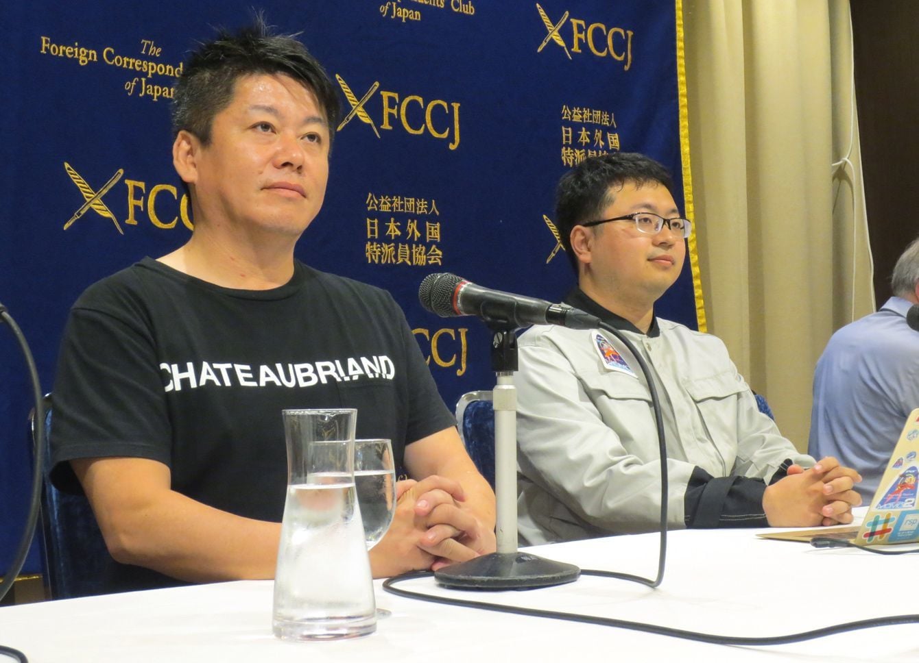 2019年5月15日、記者会見する宇宙ベンチャー、インターステラテクノロジズ(IST)の稲川貴大社長(右)と、元ライブドア社長の堀江貴文氏