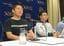2019年5月15日、記者会見する宇宙ベンチャー、インターステラテクノロジズ(IST)の稲川貴大社長(右)と、元ライブドア社長の堀江貴文氏