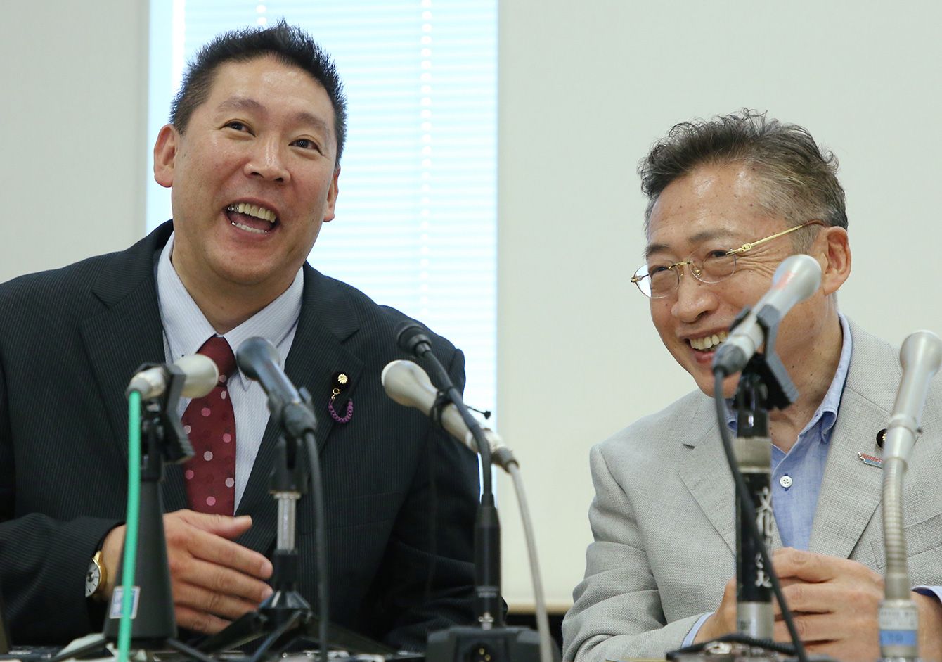 会談後に記者会見するNHKから国民を守る党の立花孝志代表(左)と無所属の渡辺喜美元行政改革担当相。渡辺氏が代表を務める新会派「みんなの党」を結成する=2019年7月30日、東京・永田町の参議院議員会館(写真=時事通信フォト)