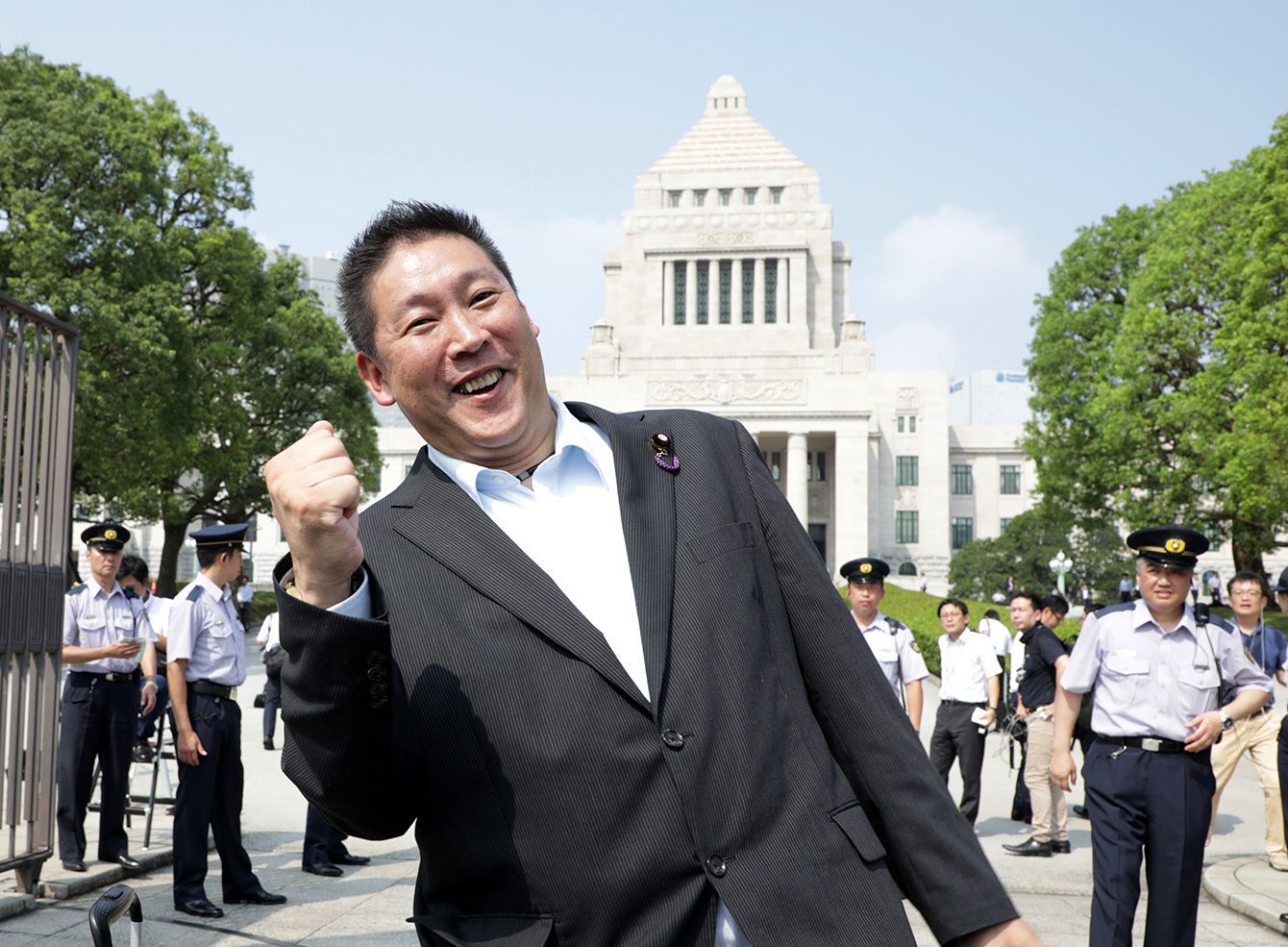 初登院し、ポーズを取るNHKから国民を守る党の立花孝志代表=2019年8月1日、国会前