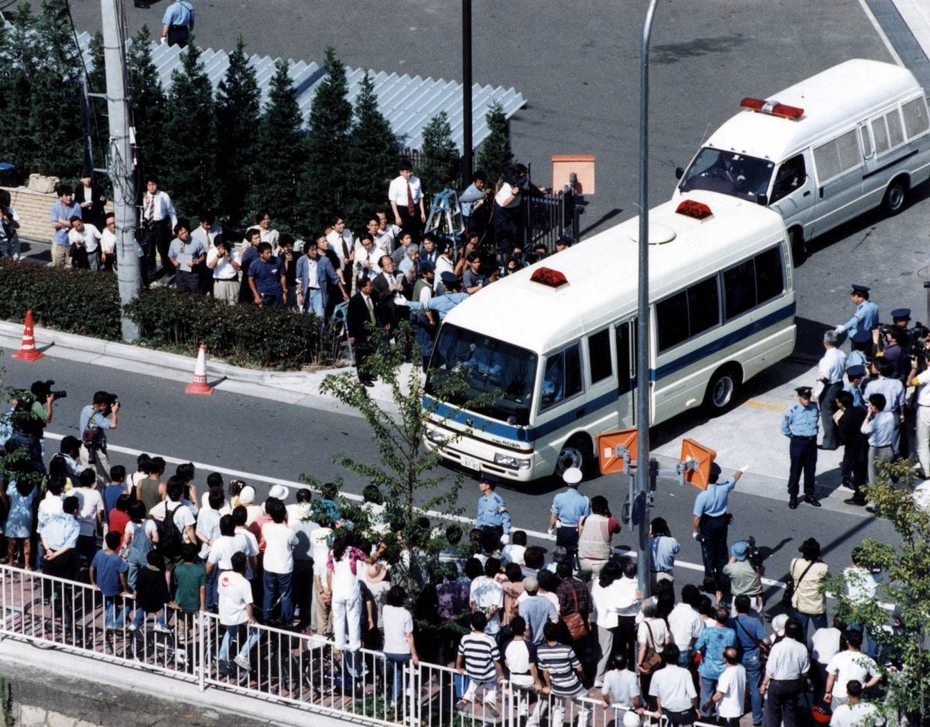 神戸小学生連続殺傷事件/須磨署から神戸地検に向かう容疑者。大勢の報道陣や住民の見守る中、神戸地検に向かう土師淳君殺害容疑者の中学生を乗せたマイクロバス=神戸市の須磨警察署前で、山下恭二写す。兵庫県/神戸市。1997年6月29日撮影