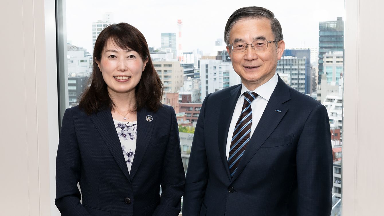 宇宙飛行士の山崎直子氏(左)とイーオン社長の三宅義和氏(右)