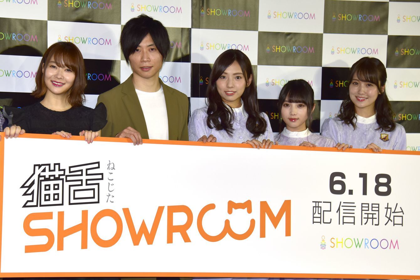 ライブ配信番組「猫舌SHOWROOM」の発表会に出席した(左から)指原莉乃さん、前田裕二SHOWROOM社長、乃木坂46の新内眞衣さん、与田祐希さん、衛藤美彩さん=2018年6月4日、東京都港区