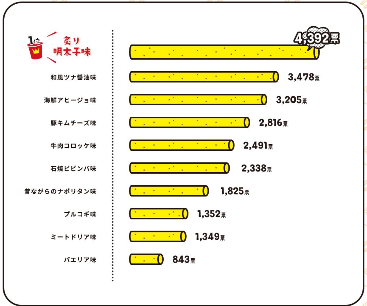 「じゃがりこの食べたい味 大募集!2019」の投票結果。2020年3月発売の新商品は「炙り明太子味」に決まった。