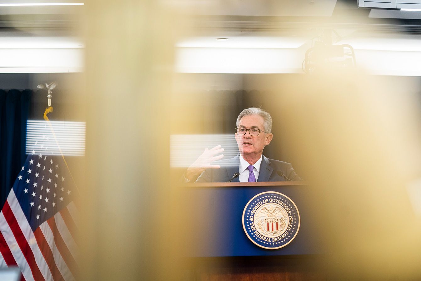 2019年7月31日、利下げ決定後に記者会見する米連邦準備制度理事会(FRB)のパウエル議長(アメリカ・ワシントン)