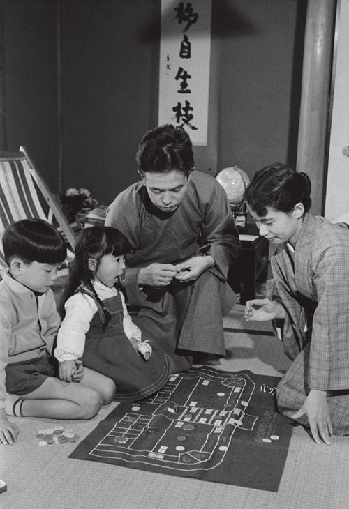 阿川さん(左から2人目)の父弘之さん(同3人目)と母みよさん(同4人目)。1957年頃、家族でゲームを楽しむ様子。