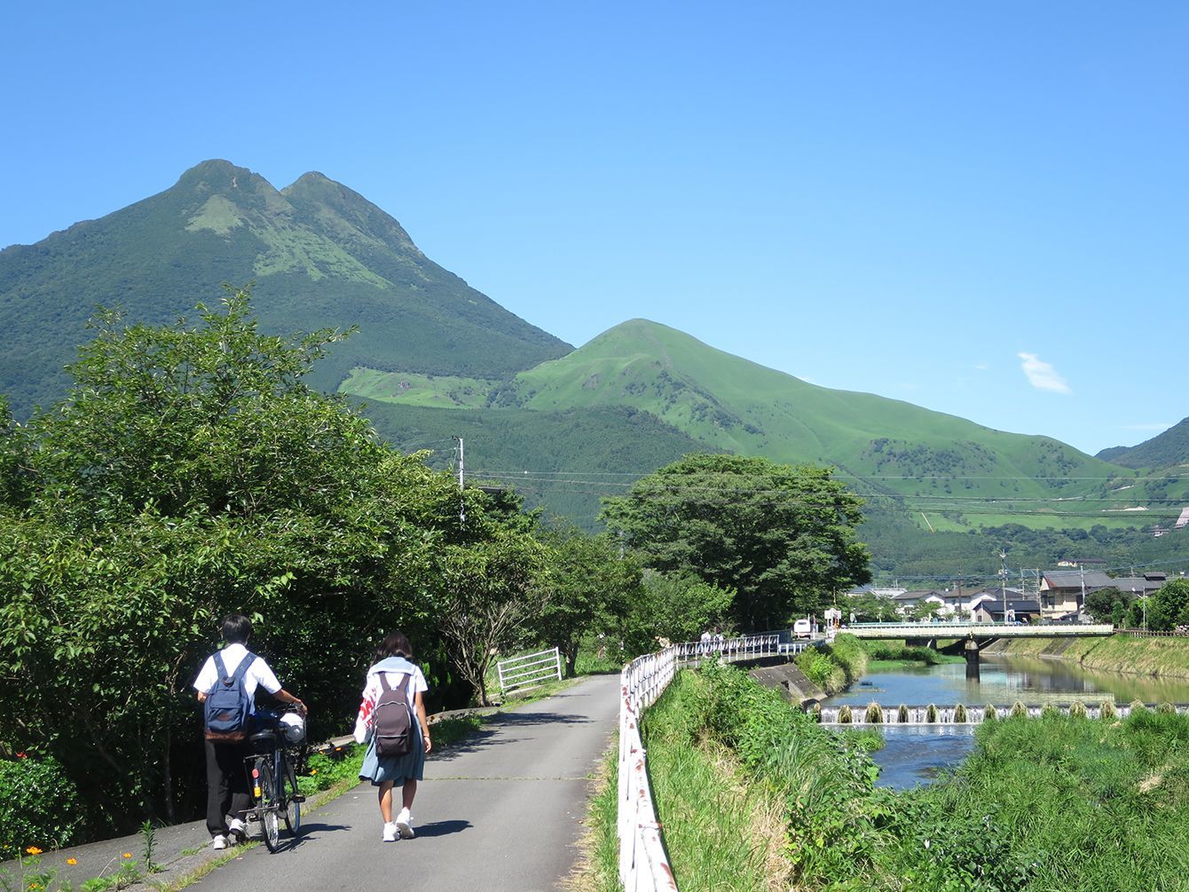 大分川沿いに見える夏の由布岳