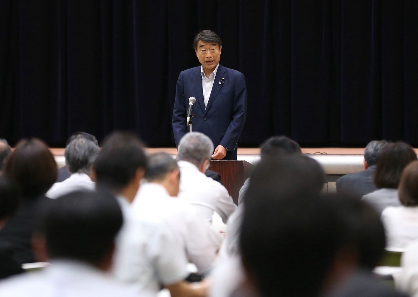 2019年6月14日、全国児童相談所長緊急会議であいさつする根本匠厚生労働相