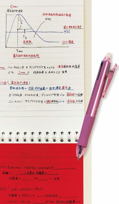 金沢大学医学部時代に使っていた「暗記ノート」(MIDORI)と消せるボールペン。暗記ノートは両サイドにリングがあり、片方にノート、もう一方に赤いシートが綴られている。