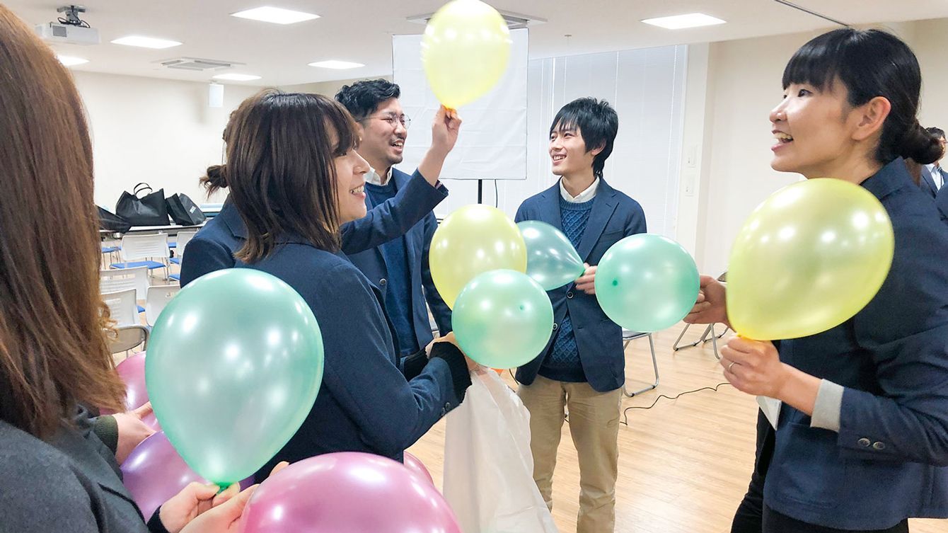 今年の入社式では、風船を使って歓迎ムードを演出した