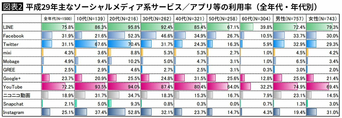 主なソーシャルメディア系サービス/アプリ等の全年代・年代別利用率(平成29年「情報通信メディアの利用時間と情報行動に関する調査報告書PDF)より