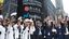 米ナスダック証券取引所前で、株式上場を祝うくら寿司関係者=2019年8月1日、アメリカ・ニューヨーク