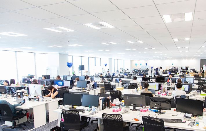 イングリウッド社内。ワンフロアで部署を隔てる壁もなく、社長・役員も同じ空間で共に働くレイアウトに、フラットで風通しのよい組織文化が感じられる。