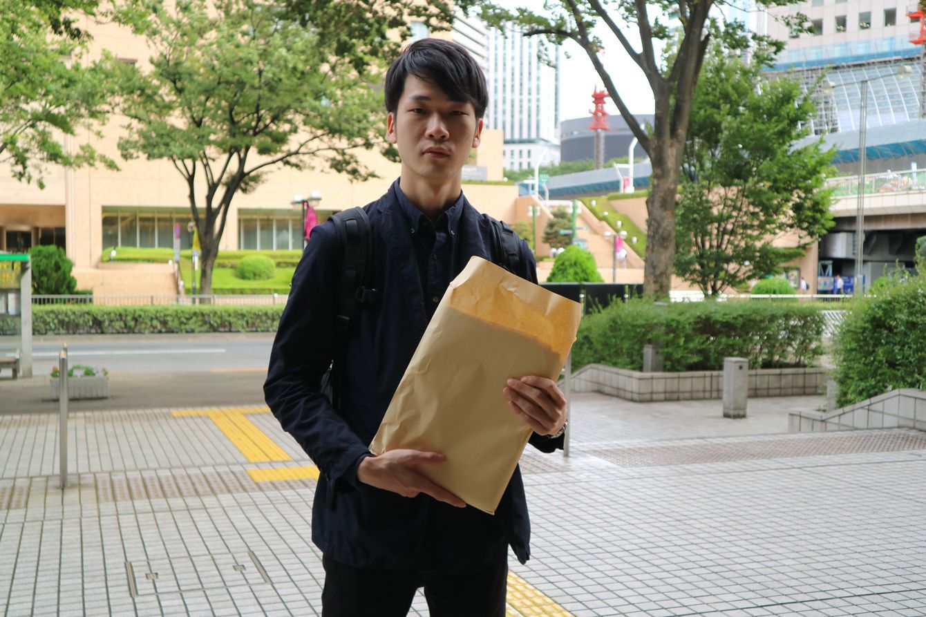 署名を提出するため東京都庁を訪れた佐藤悠司さん(20)