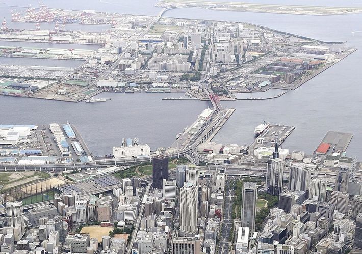 三宮中心部(手前)とポートアイランド(奥)2019年7月6日、神戸市中央区