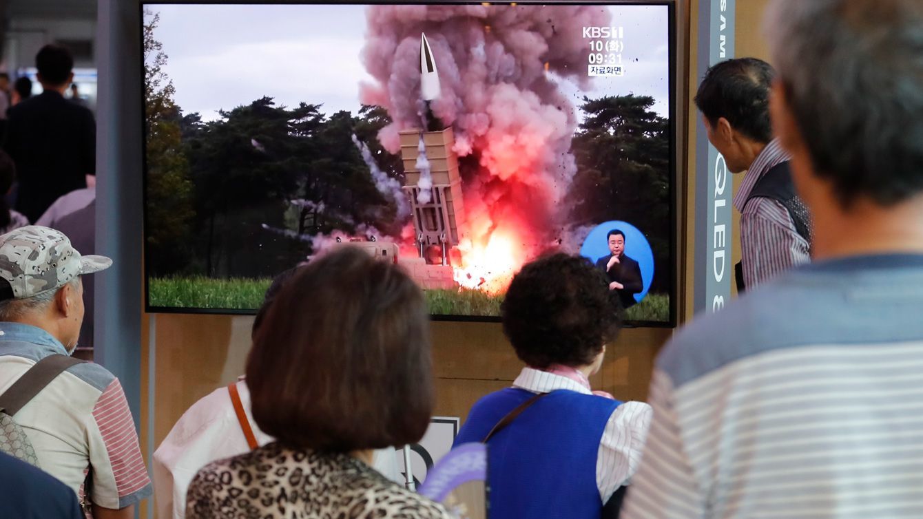 1000年以上にわたって大国に支配され続けてきた歴史を克服すべく、中国とアメリカに二股外交を仕掛ける北朝鮮は、韓国にとって「希望の光」なのか——地下鉄駅のテレビで、北朝鮮のミサイル発射のニュースに見入るソウル市民(2019年9月10日)