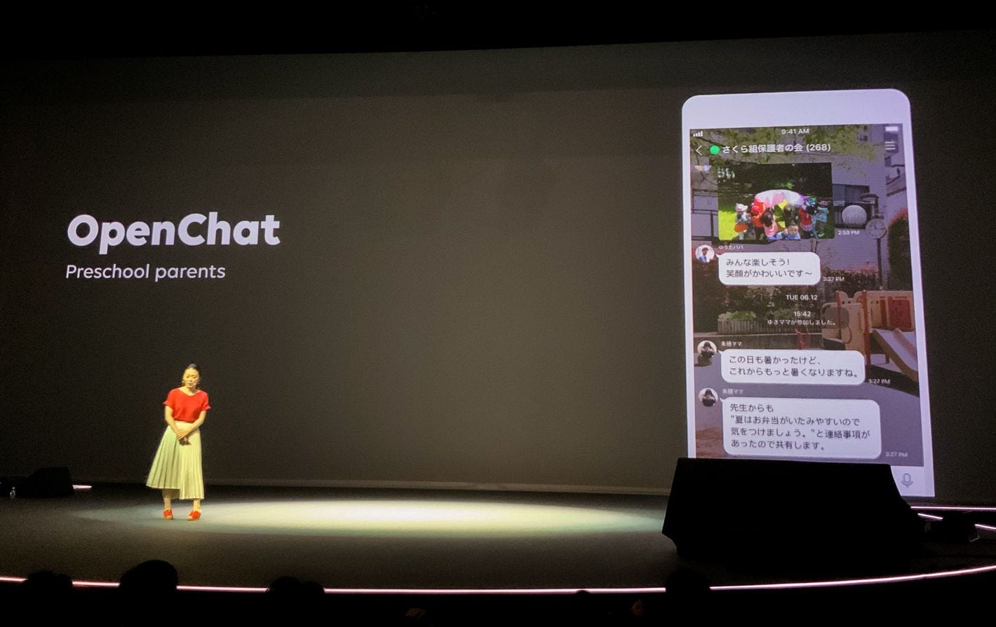 「LINE CONFERENCE 2019」での発表風景。OpenChatは自分自身と「○○ちゃんのママ」のように、複数のアイデンティティーの使い分けを想定して生まれたものだった