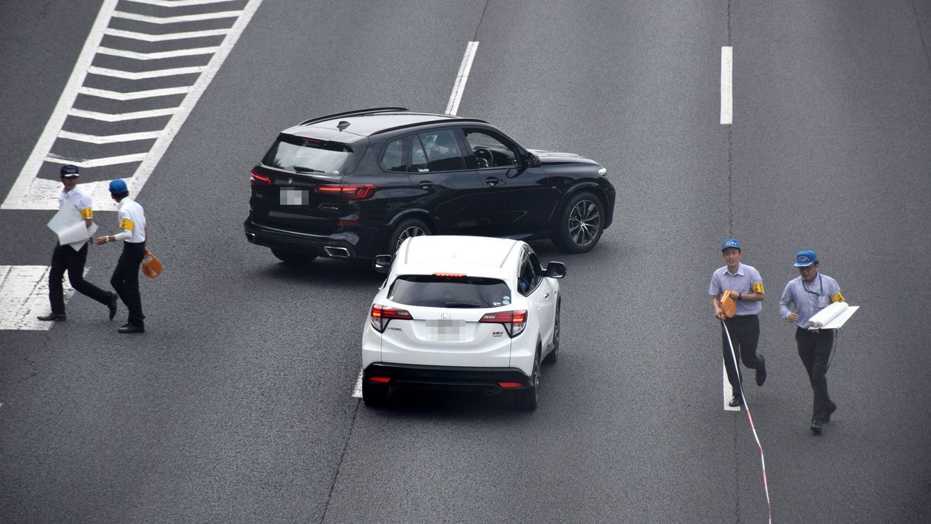 常磐道上り線で男性会社員が「あおり運転」を受け殴られた事件の実況見分で、当時の状況を確認する捜査員ら=31日、茨城県守谷市 ※一部画像処理(車両のナンバーにモザイク)してます。