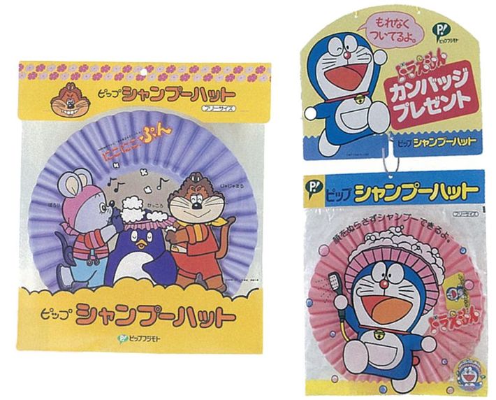 過去に販売されていたシャンプーハット。左はNHK「おかあさんといっしょ」内で放送されていた「にこにこぷん」、右は「ドラえもん」のパッケージ。(ピップ『社史』より)