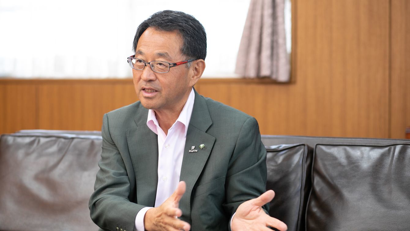 シャンプーハットをかぶって撮影に応じる松浦由治社長
