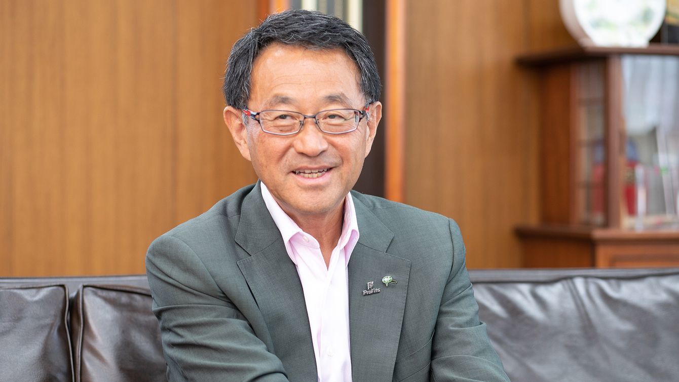 シャンプーハットをかぶって撮影に応じる松浦由治社長