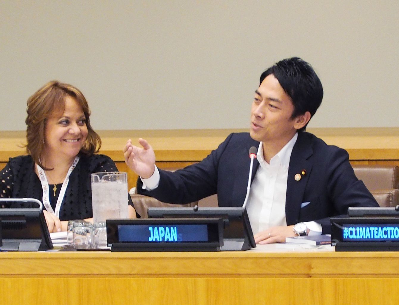 ニューヨークの国連本部で開かれた都市の脱炭素化に関するイベントで演説する小泉進次郎環境相(右)=2019年9月22日撮影