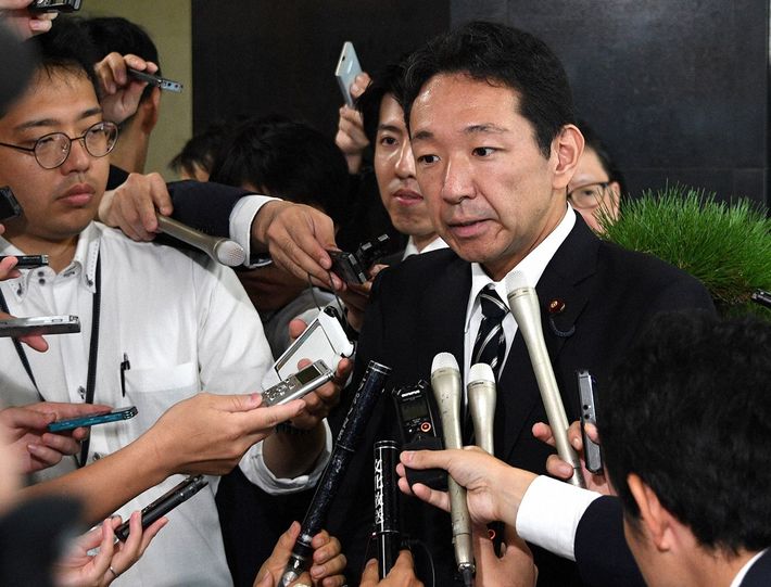 厚生労働政務官を辞任する原因となった口利き疑惑について記者の質問に答える自民党の上野宏史衆院議員=2019年9月11日