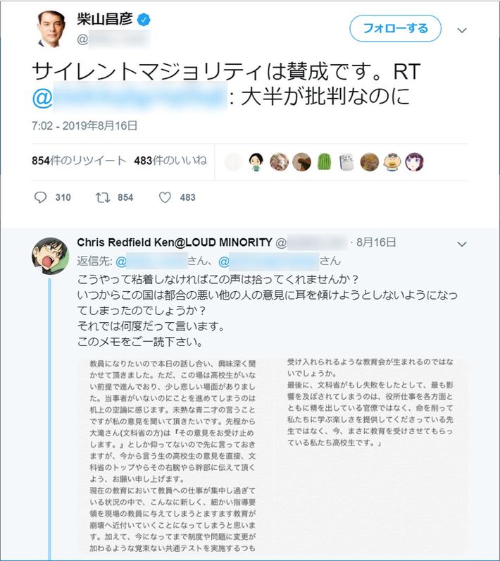 柴山昌彦前文部科学大臣のツイッター