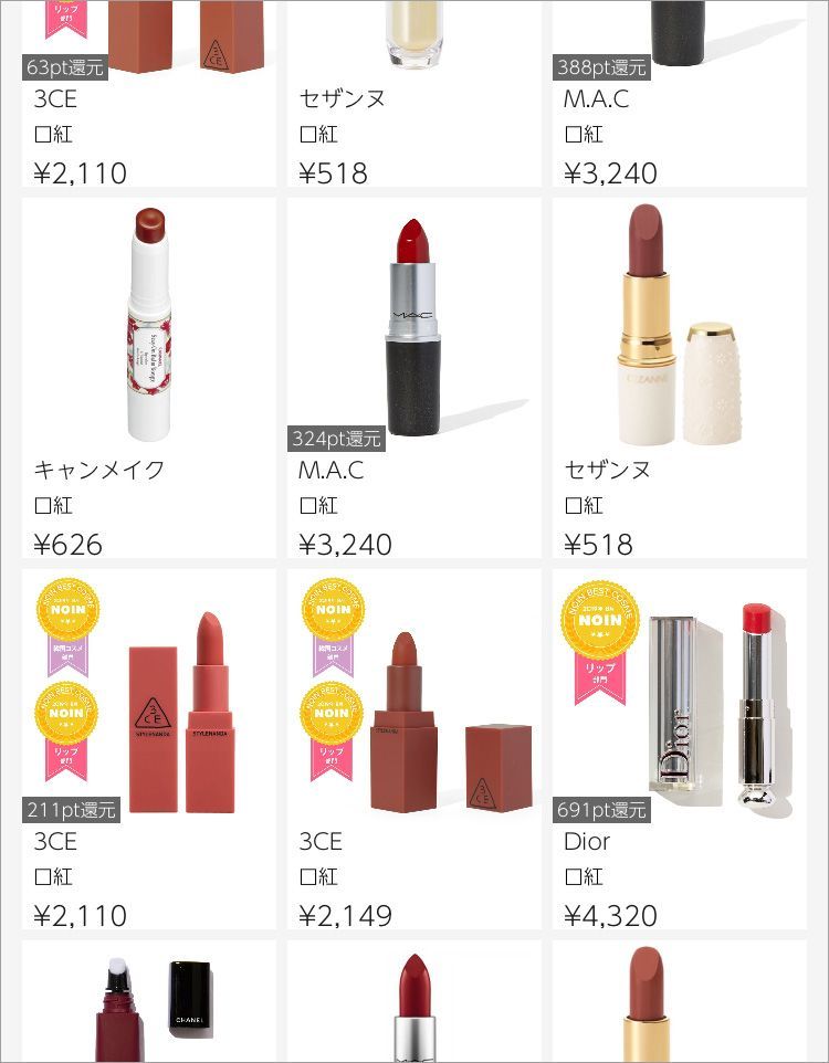 ノインの比較検討商品の画面。高級ブランドのリップとプチプラブランドが並列に検討されていることが分かる。