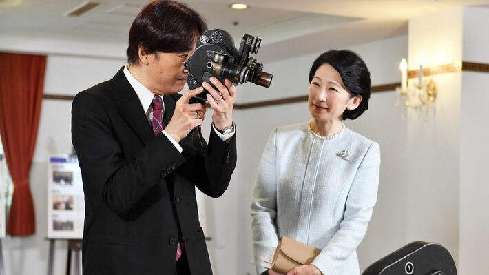 「皇室アルバム」放送3000回を記念した展示で、天皇、皇后両陛下の結婚式の撮影に使われたカメラをご覧になる秋篠宮ご夫妻=2018年7月31日、東京都千代田区の山の上ホテル