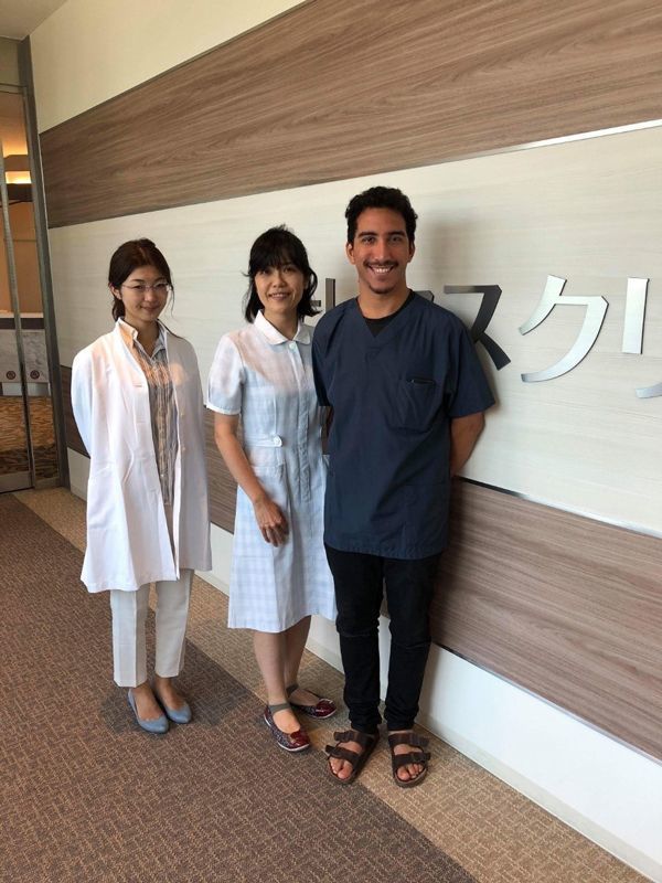 妹尾優希さん(左)とカリム・モウトチョウ君(右)。ナビタスクリニック新宿を見学して。中央は濱木珠恵院長。写真提供=妹尾優希さん